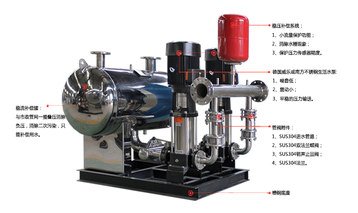 无负压设备功能特点:1、叠压节能无负压供水设备在运行时借助市政自来水的压力,在原有管网压力的基础上叠加所需的压力差,差多少,补多少,充分利用管网的余压,系统自动调整水泵运行台数或调整水泵转速,实现一直高效率点运行。当进水压力能满足设计压力时,水泵进入休眠节能状态,因此大大节省了运行费用。2、压力控制无负压供水设备实时通过压力传感器检测出口压力,将检测值和设定值进行比较,计算出在市政自来水管网余的压基础上需要增加的压力值,确定水泵投入台数和变频器输出频率,调整水泵的转速实现叠压恒压供水或叠压变压供水的控制。3、自动化程度高具有手动启动停止、自动启动停止方式、预留远距离操作接口、备用泵自动切换、压力控制(恒压/变压)、高低电压保护、漏电保护、跳闸保护、过载保护、过热保护、欠相保护等功能,系统全自动运行无须专人值守,人机界面,可远程调整、监测和维护。4、卫生安全全密封运行,异物不能进入系统内部,不与空气直接接触。如防负压装置启动时,膜滤装置将空气中的细菌挡住,不进入系统,防止用水二次污染。稳流罐和主要过流部件均采用304不锈钢制造,确保用水卫生,满足人们对饮用水越来越高的要求,也符合国际涉水卫生规范。5、停电不停水直接和市政自来水管网相连,在停电时加压泵虽停止工作,但自来水管网压力依旧可维持低区用户供水,即使在停水时,用户也可以靠稳流灌存水维持短时间供水。6、断水或缺水保护在进水断水或缺水时,无负压供水设备停止运行。当设备恢复进水且达到设定条件时,设备自动恢复正常运行。7、节省投资、节省运行和维护成本没设蓄水池等储水设施,节省占地面积,降低建筑负荷,从而节省了大笔土建投资费用。系统全自动运行无须专人值守,也没有水质处理仪器,免去定期清洗、消毒等工作;减少了系统滴、漏、益流的损失。故节能效果十分显著。8、安装简单快捷无负压供水设备现场只需将设备大件组装起来,连接进、出水管法兰即可,施工周期短,安装简单。规格参数:规 格